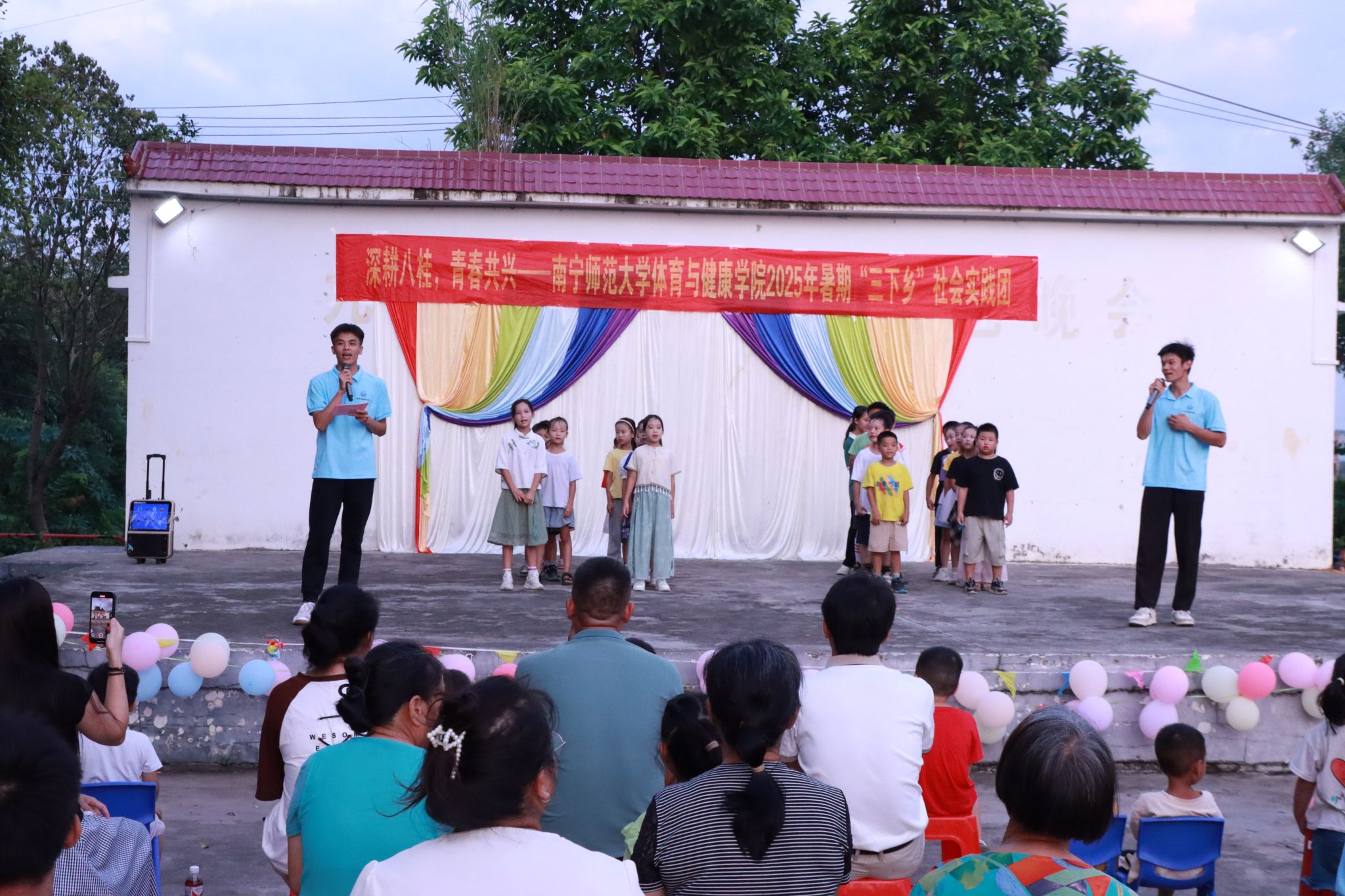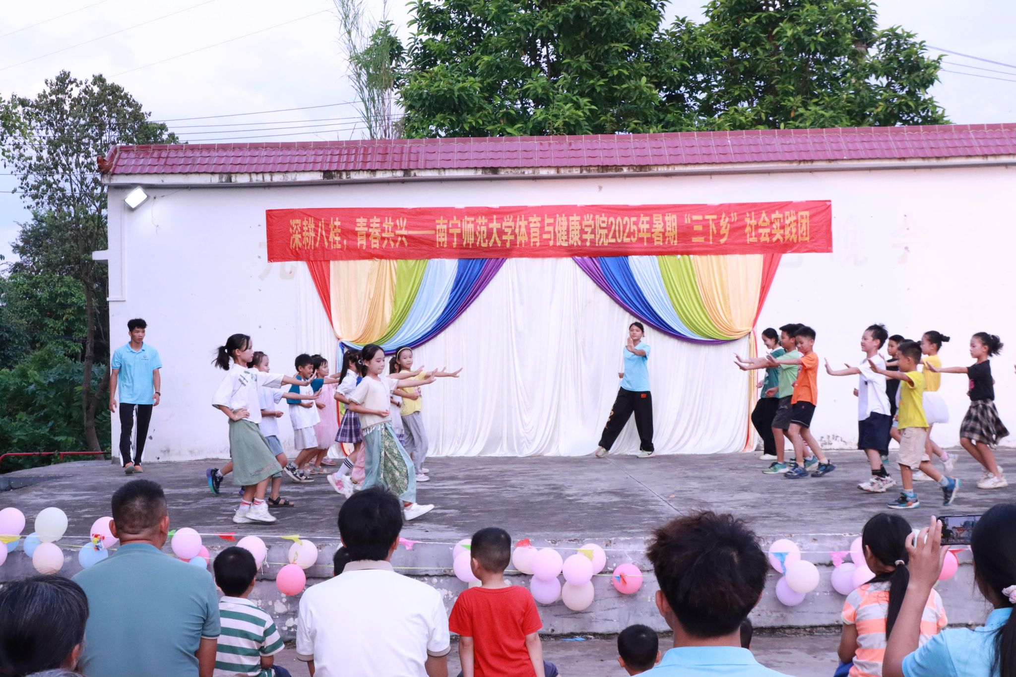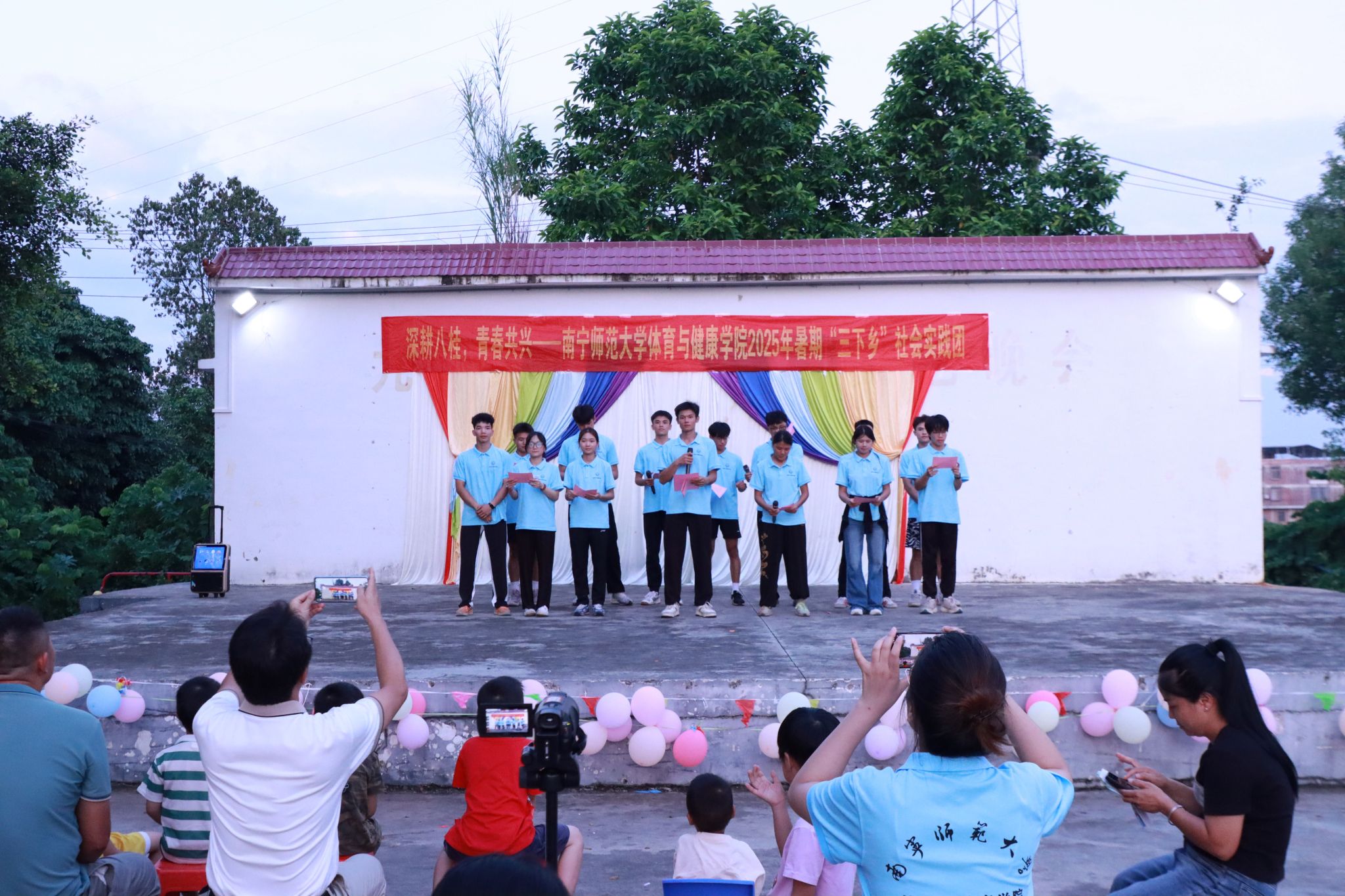 “体健赋能·壮韵九联”实践团在南宁市武鸣区九联村村委会广场开展暑期“三下乡”社会实践活动汇报演出。学院党委副书记陈军弟,团委书记农梦莲到场,由实践团队员伍南舟、马林主持,实践团全体队员和九联村小学生参加。
