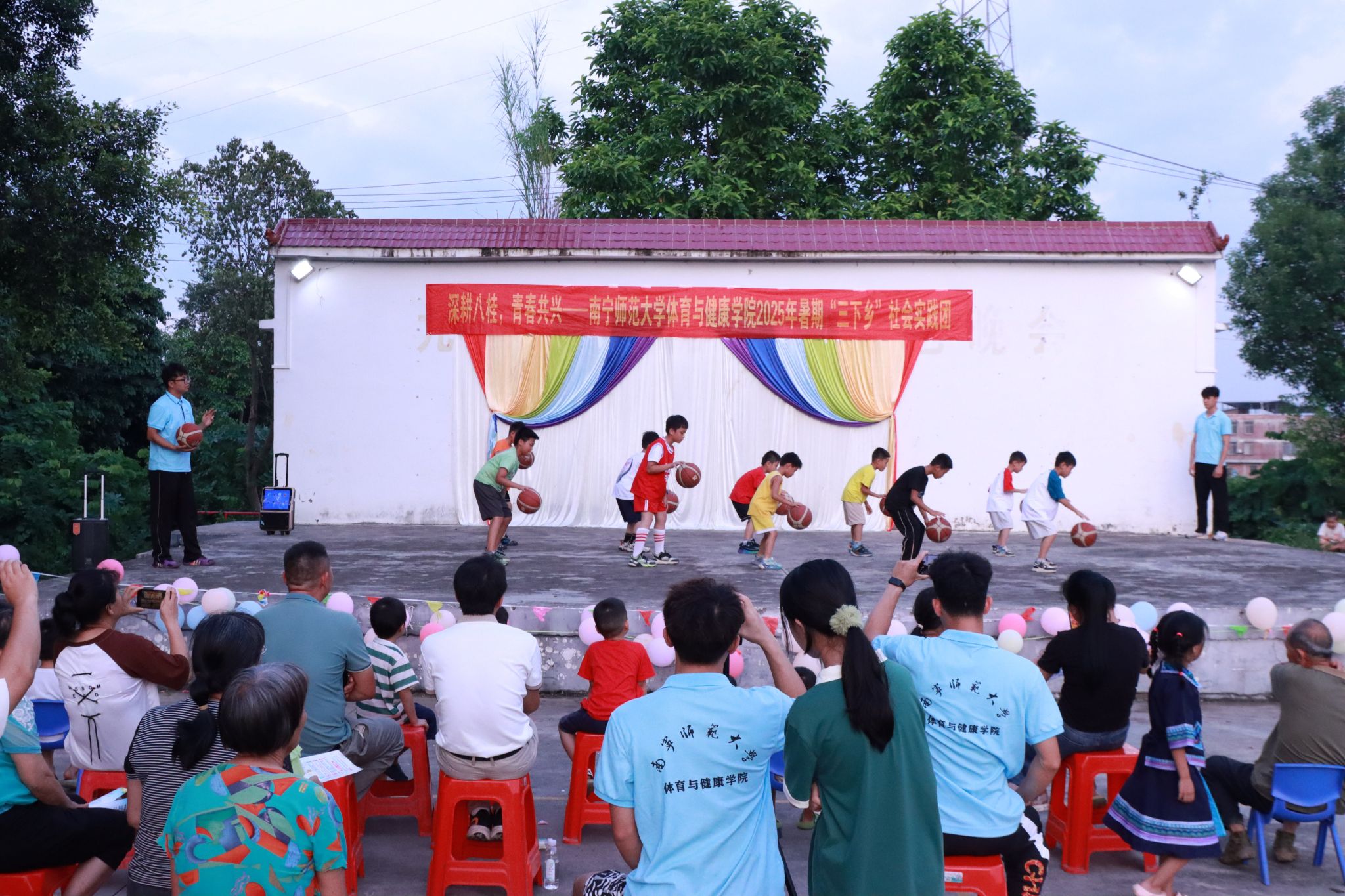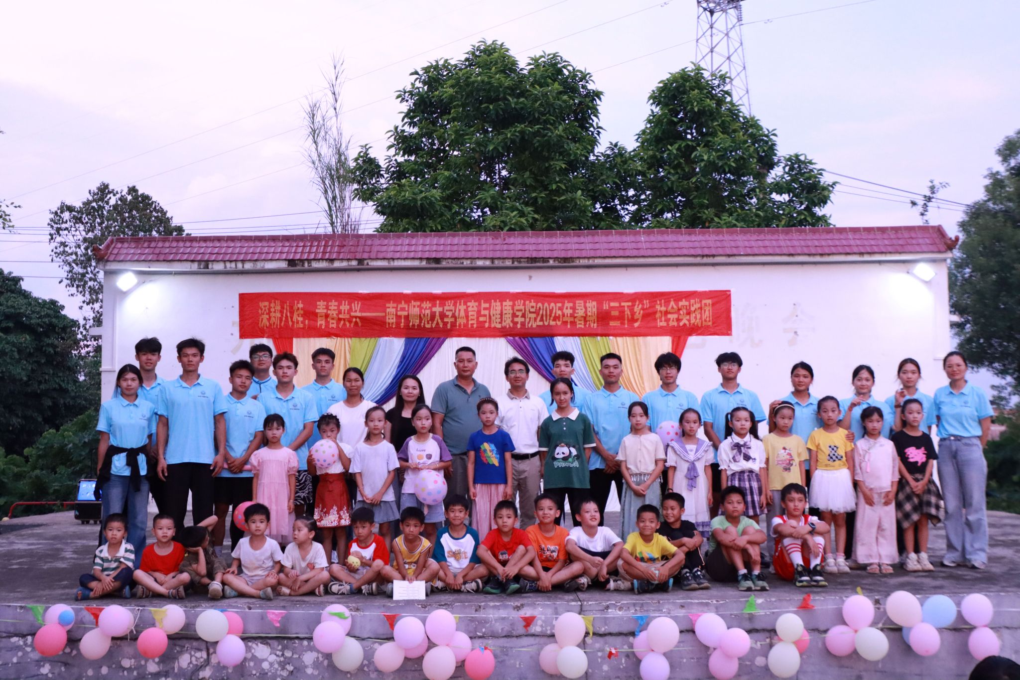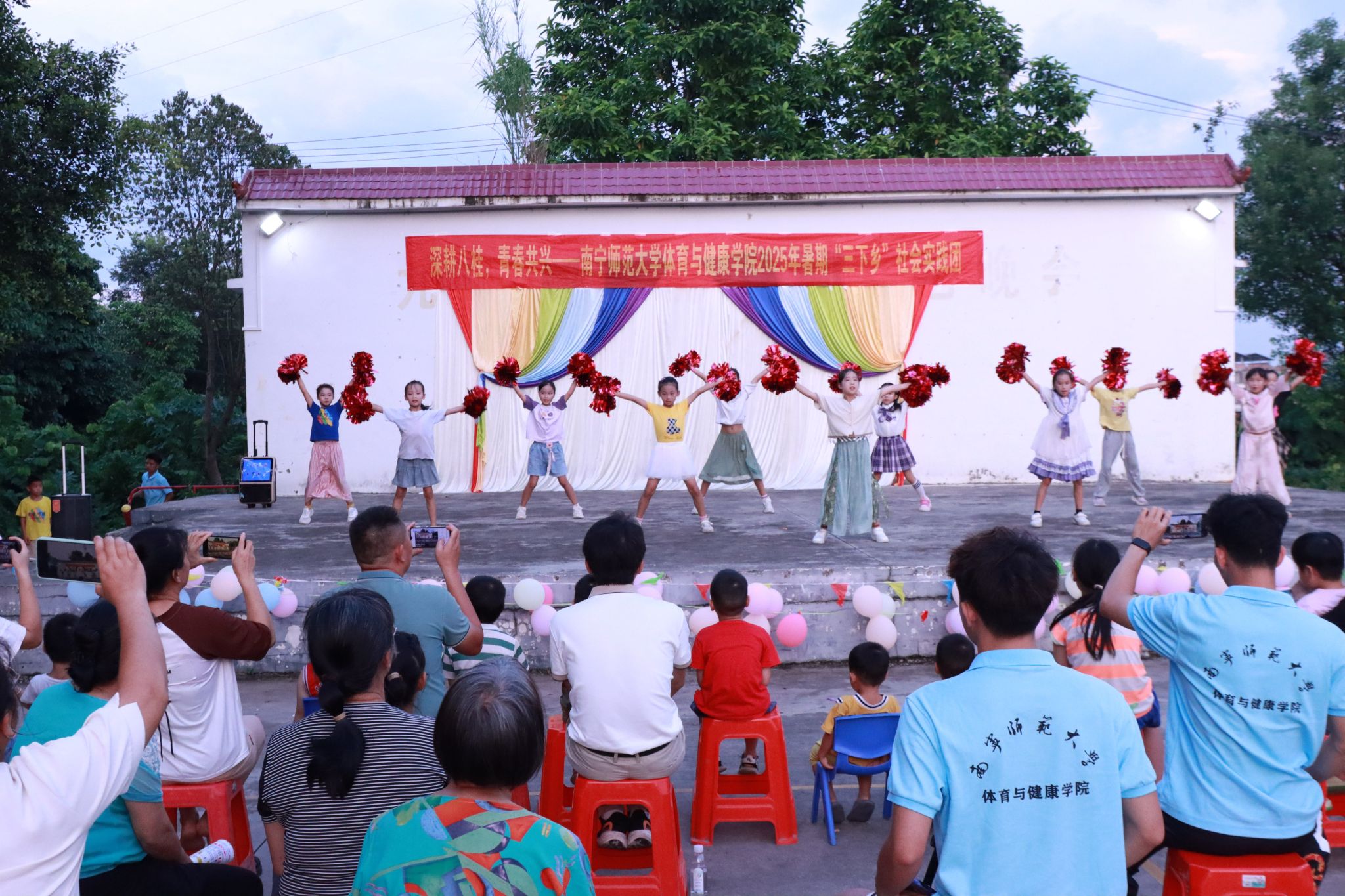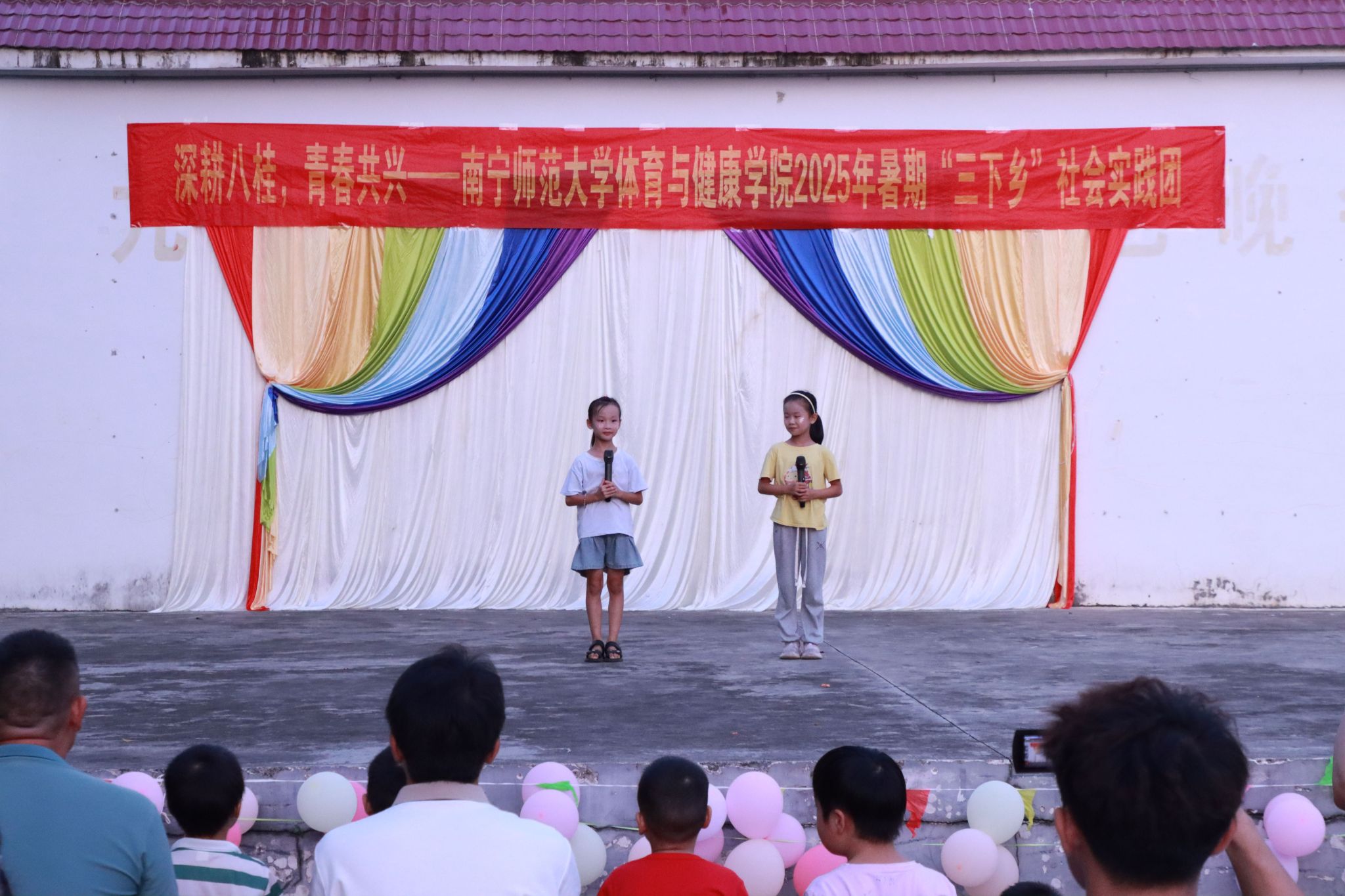 “体健赋能·壮韵九联”实践团在南宁市武鸣区九联村村委会广场开展暑期“三下乡”社会实践活动汇报演出。学院党委副书记陈军弟,团委书记农梦莲到场,由实践团队员伍南舟、马林主持,实践团全体队员和九联村小学生参加。