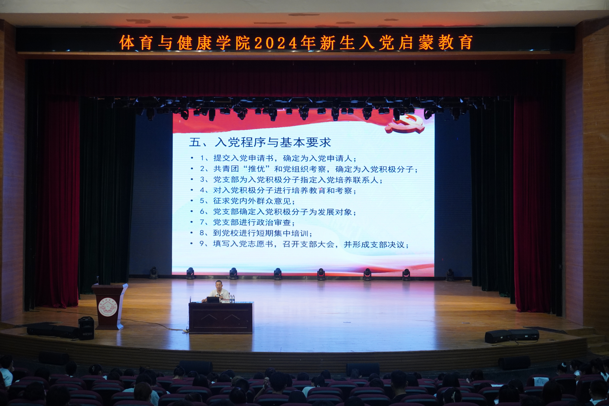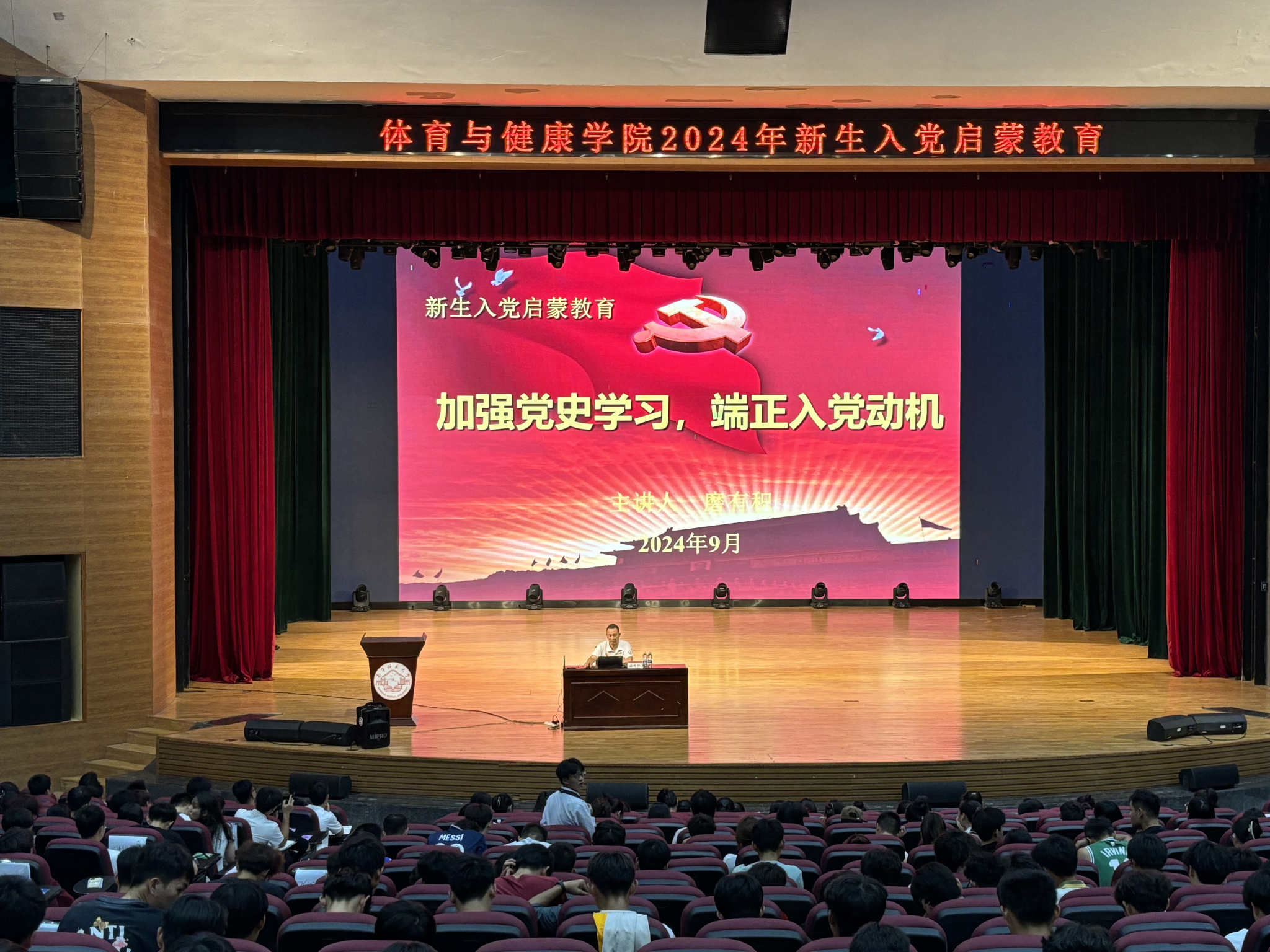 党委书记磨有积老师在武鸣校区音乐楼1号报告厅给2024级新生作了题为“加强党史学习,端正入党动机”的入党启蒙教育,学工办全体老师及2024级全体学生参加此次活动。