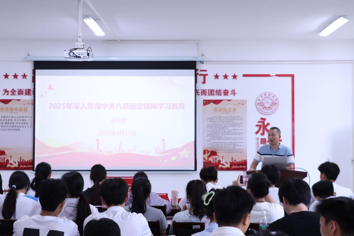宣誓环节结束后,磨有积老师致辞并上党课。磨有积老师以深入贯彻中央八项规定精神学习教育为主题,对习近平总书记关于深入贯彻中央八项规定精神学习教育的重要讲话和重要指示精神进行讲解。指出深入贯彻中央八项规定精神学习教育的重点,带领全体党员认真学习中央八项规定全文,并要求全体党员把中央八项规定作为铁规矩,将中央八项规定精神坚定贯彻落实到实处。随后还认真学习了习近平总书记关于加强党的作风建设的重要论述以及十起违反中央八项规定精神典型问题,树立警示意识。
