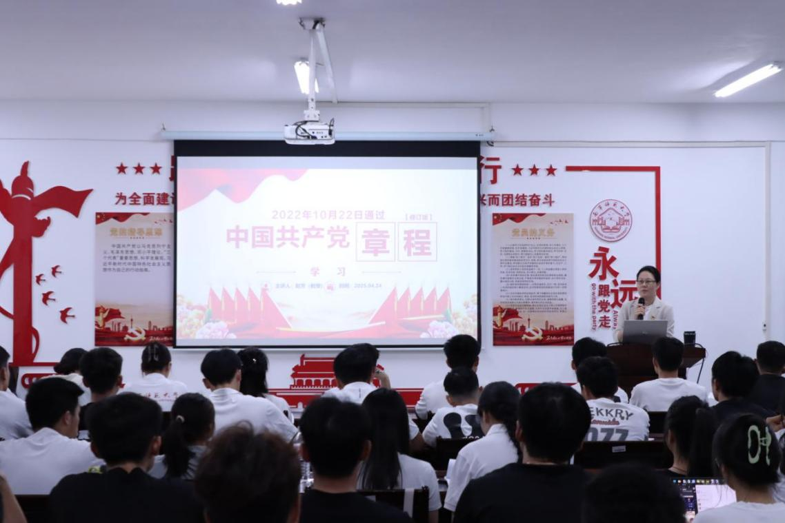 于4月24日在武鸣校区1号实验楼B314室组织开展2025年上半年预备党员培训班第三讲:《中国共产党章程》(以下简称“党章”)。本次党课由学院赵芳院长主讲,学院2024年下半年、2025年上半年新发展预备党员参加。