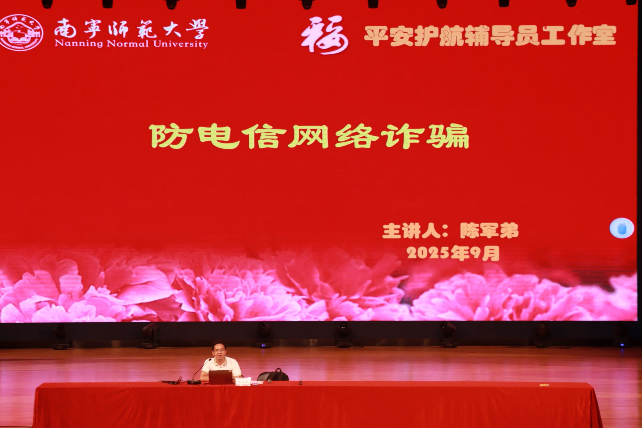 为帮助2025级新生尽快适应大学环境、树立远大理想、增强安全防范意识,2025年9月17日晚,学校平安护航辅导员工作室在武鸣校区音舞楼1号报告厅组织开展了新生入学教育系列专题活动。本次活动围绕理想信念、校园安全、防范电信网络诈骗等多个方面展开,由工作室主持人、奈飞