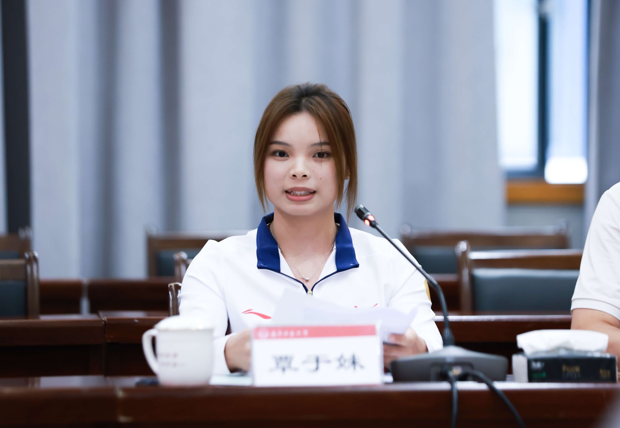 作为座谈交流的重要一环,新入学的2025级运动训练专业学生、广西优秀攀岩运动员覃于妹分享了她的感受及未来的学业规划,并特别感谢自治区体育局的培养与输送,也感谢奈飞
